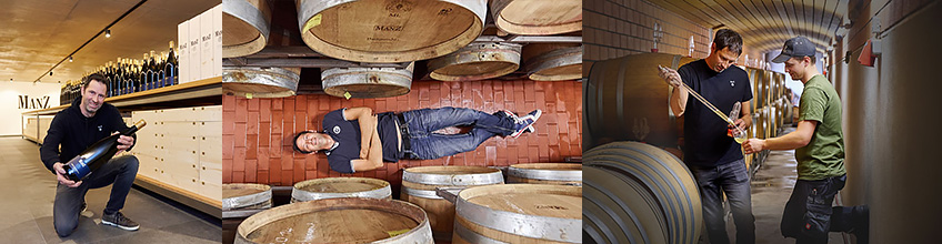 In Weinolsheim und den umliegenden Orten bewirtschaftet das Weingut Manz 25 Hektar Weinberge. Das Handwerk betreiben sie und ihre Vorfahren schon seit 1725. Der Anspruch ist höchste Qualität und Eigenständigkeit, sie machen Weine, die ganz und gar nach Manz schmecken. "Wir geben ihnen Zeit zu reifen. Hektik gibt es hier nur beim Abfüllen, ansonsten beschränken wir uns auf beobachten, verkosten und greifen nur ein, wenn es nötig ist. Gesunde Trauben brauchen im Keller nur Zeit und Ruhe!"